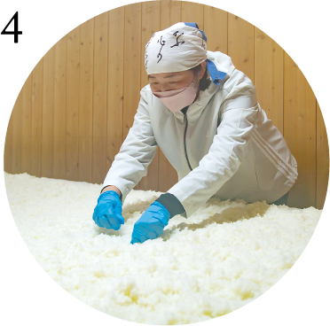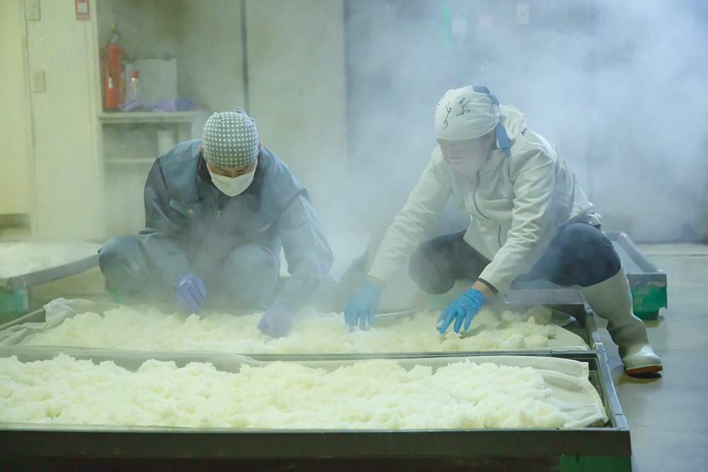 We make koji by hand by spreading steamed rice across the table and sprinkling it with koji mold spores.